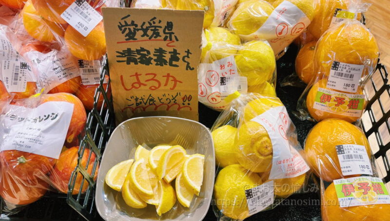 この時期はイチゴと並んで柑橘も種類豊富で試食もありました。愛媛や和歌山産もたくさん並んでいます。