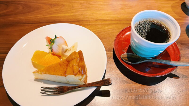 ケーキは懐かしい感じのチーズケーキで、ちょっとモチっとした和菓子のような不思議な食感であっさりいただけます。